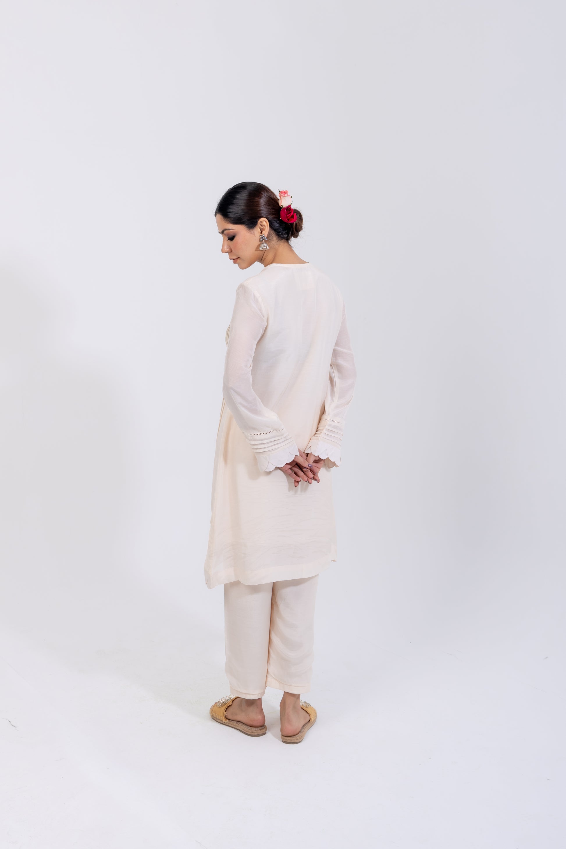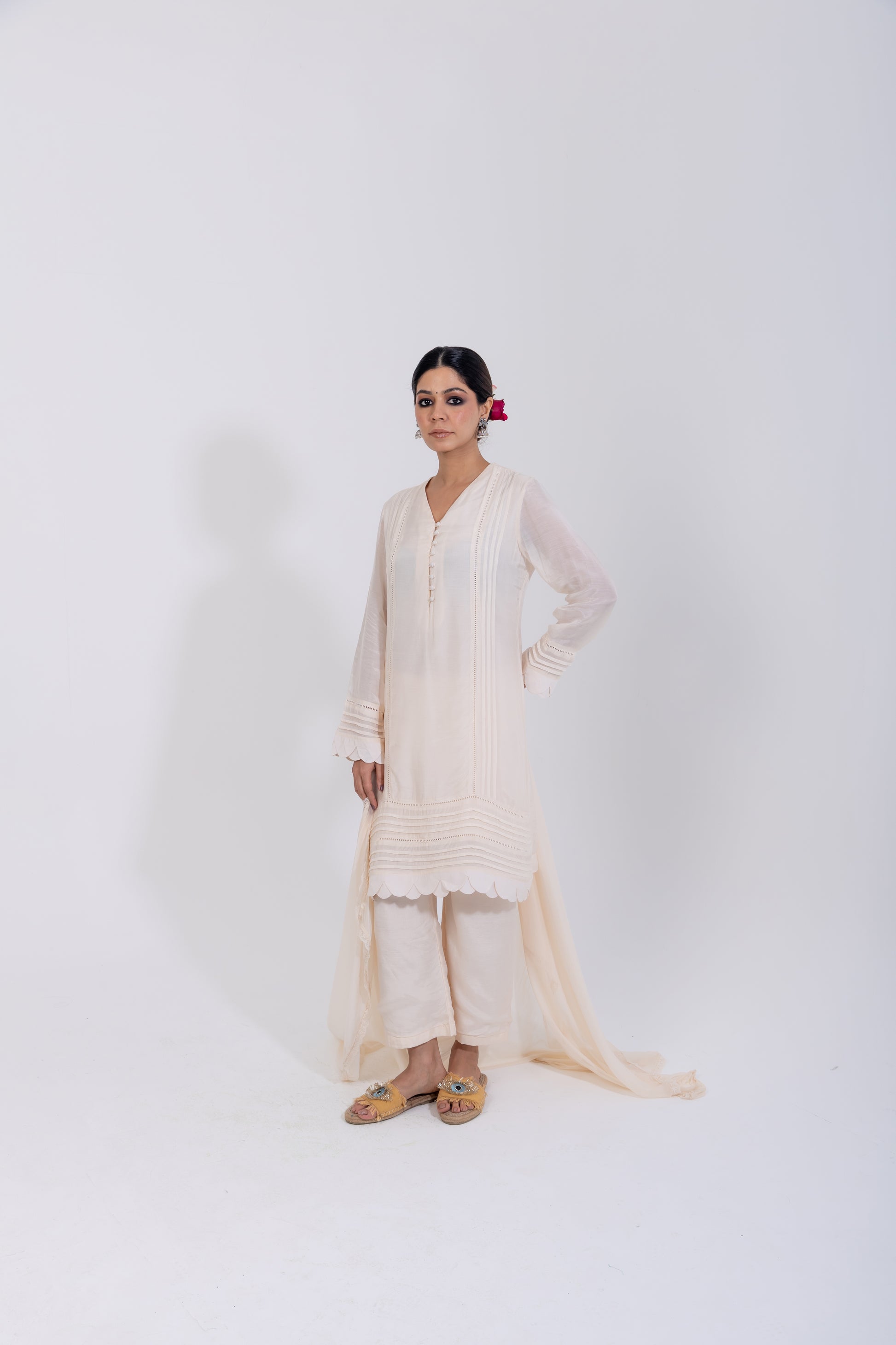 Elevate your wardrobe with this exquisite ivory kurta set, crafted on a silk-blend base with a subtle sheen. Featuring a V-neckline adorned with delicate potli buttons along the placket, the kurta is enhanced with pleating and ladder lace detailing on the front and sleeves. A scalloped hemline adds soft, feminine charm, while wide-legged ivory cotton pants ensure effortless elegance. Paired with a chiffon dupatta trimmed in floral lace, this ensemble is a statement piece perfect for celebrations, special gatherings, and graceful day-to-evening dressing.