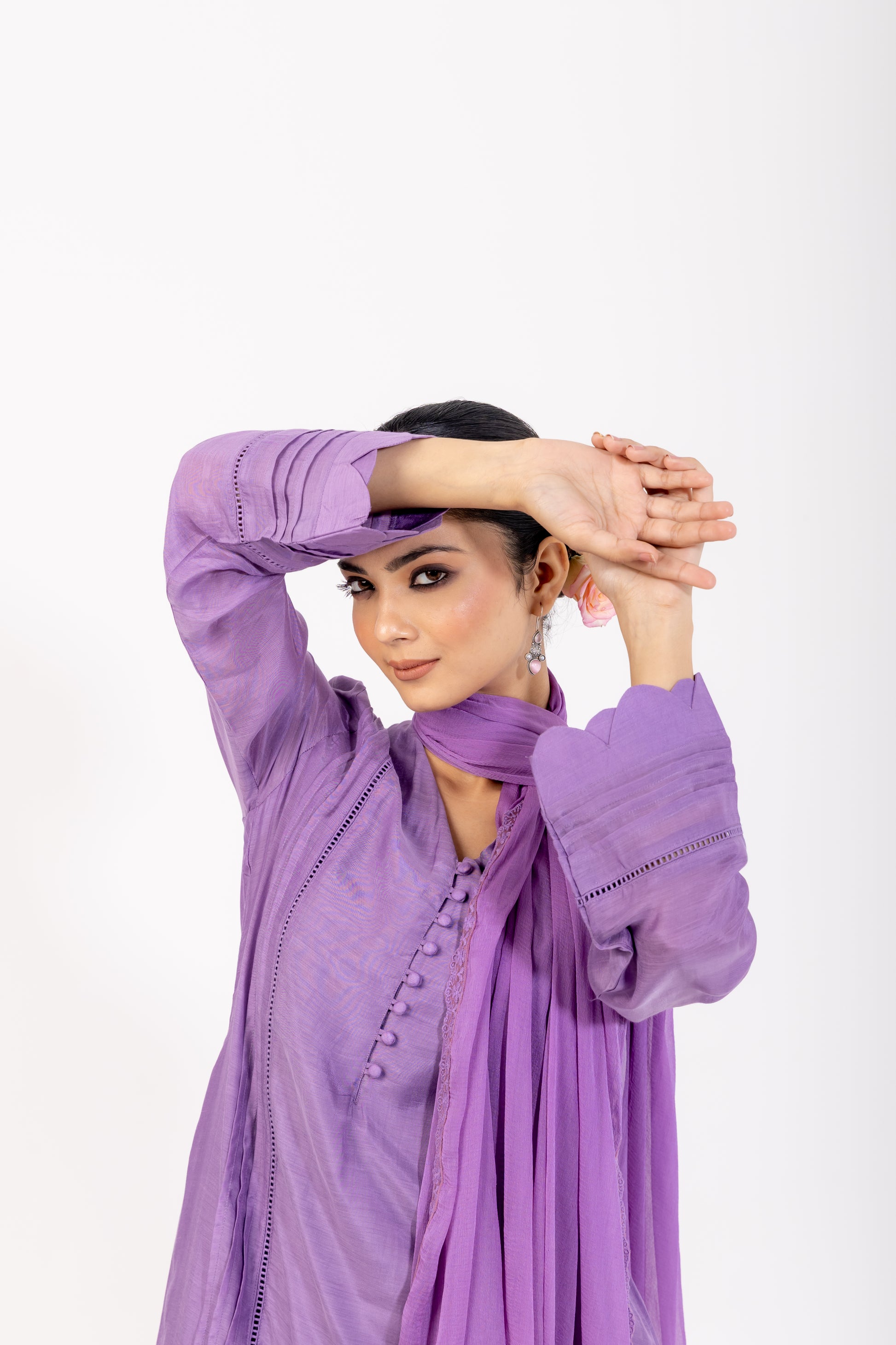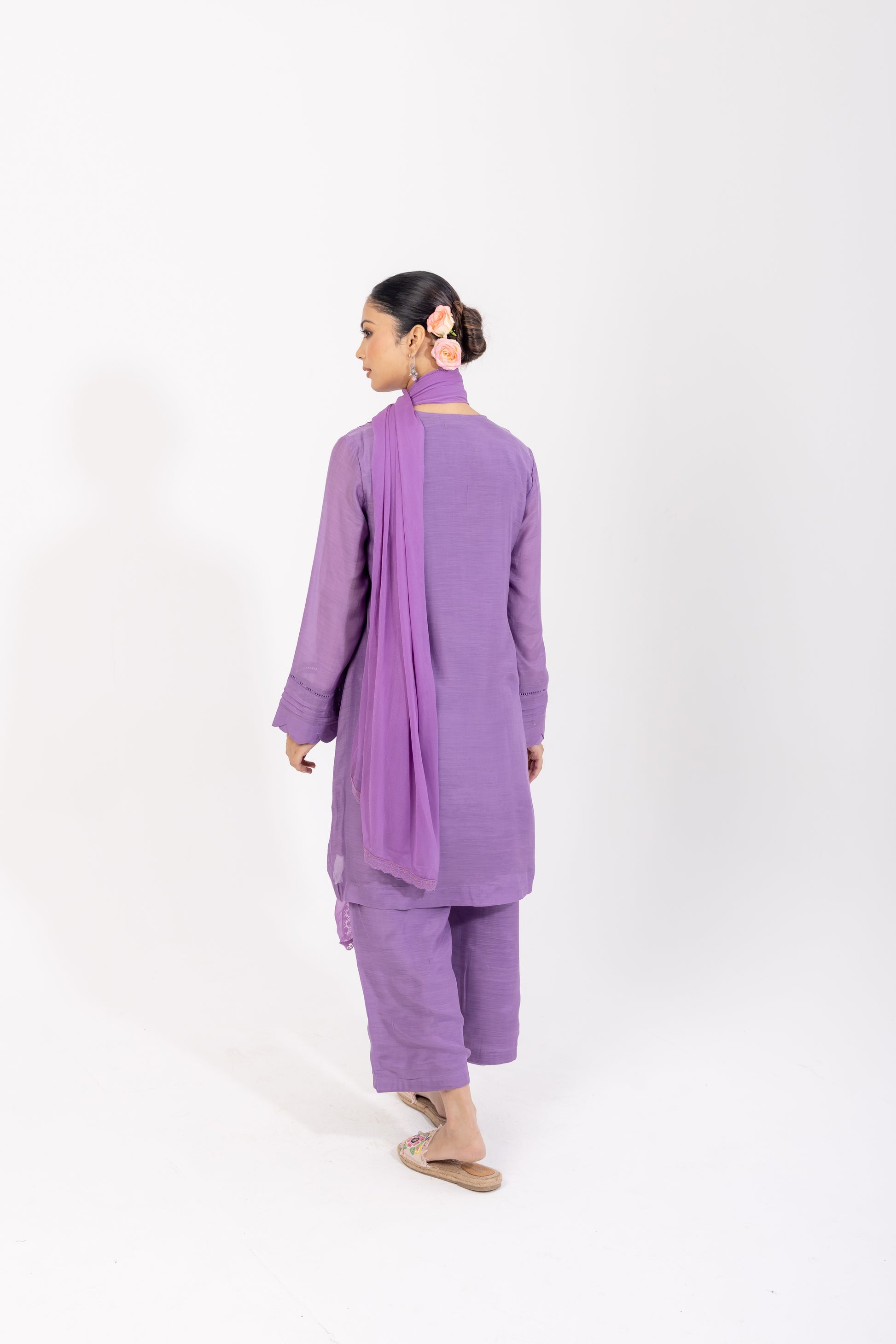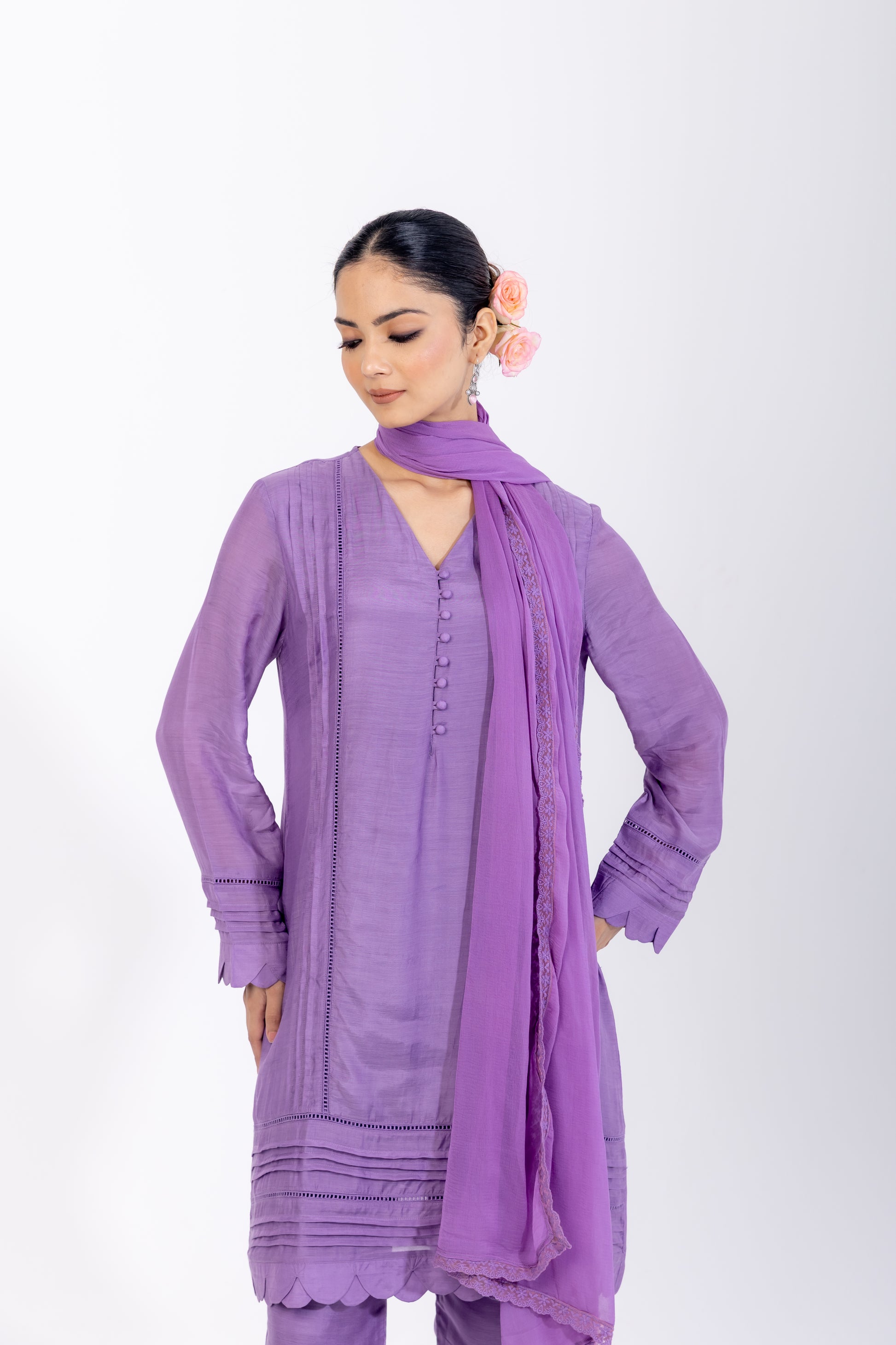 Make a statement in this dreamy lavender kurta set, crafted on a silk-blend base with a subtle sheen. The V-neckline is adorned with delicate potli buttons along the placket, complemented by pin-tuck and ladder lace detailing on the front and sleeves. A scalloped hemline adds soft, feminine charm, while wide-legged ivory cotton pants complete the ensemble with effortless elegance. Finished with a chiffon dupatta edged in floral lace, this piece is perfect for festive celebrations, special gatherings, and refined day-to-evening dressing.